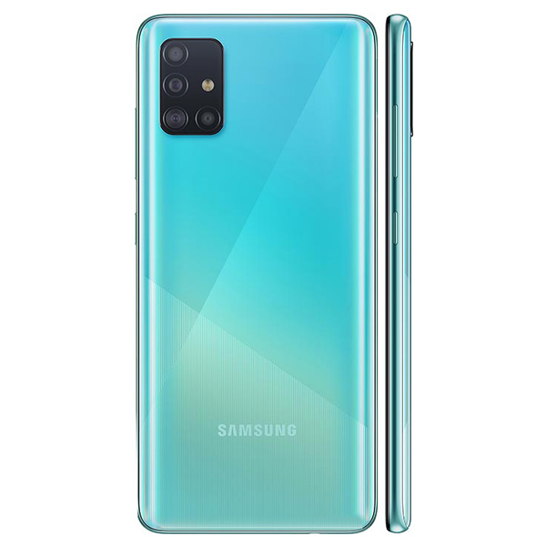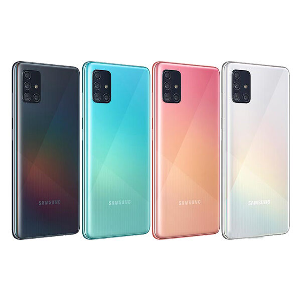 گوشی موبایل دو سیمکارت Samsung Galaxy A51 128G RAM 8Gبا رنگهای مشکی، صورتی، سفید و آبی ارائهشده است که سطح براق و طراحی رنگینکمانی رنگها در قاب پشتی آن را تبدیل به یک گوشی شیک و محبوب نموده است. این گوشی دارای وزن 172 گرم می باشد. گوشی موبایل Galaxy A51 دارای صفحهنمایش 6.4 اینچی، تقریباً بدون قاب بهصورت لبه به لبه، رزولوشن 1080 * 2400 پیکسل که تراکم پیکسلی 405 پیکسل در هر اینچ را ارائه میدهد و نسبت تصویر در آن 20:9 میباشد، وضوح FHD plus و مجهز به فناوری Super AMOLED است.